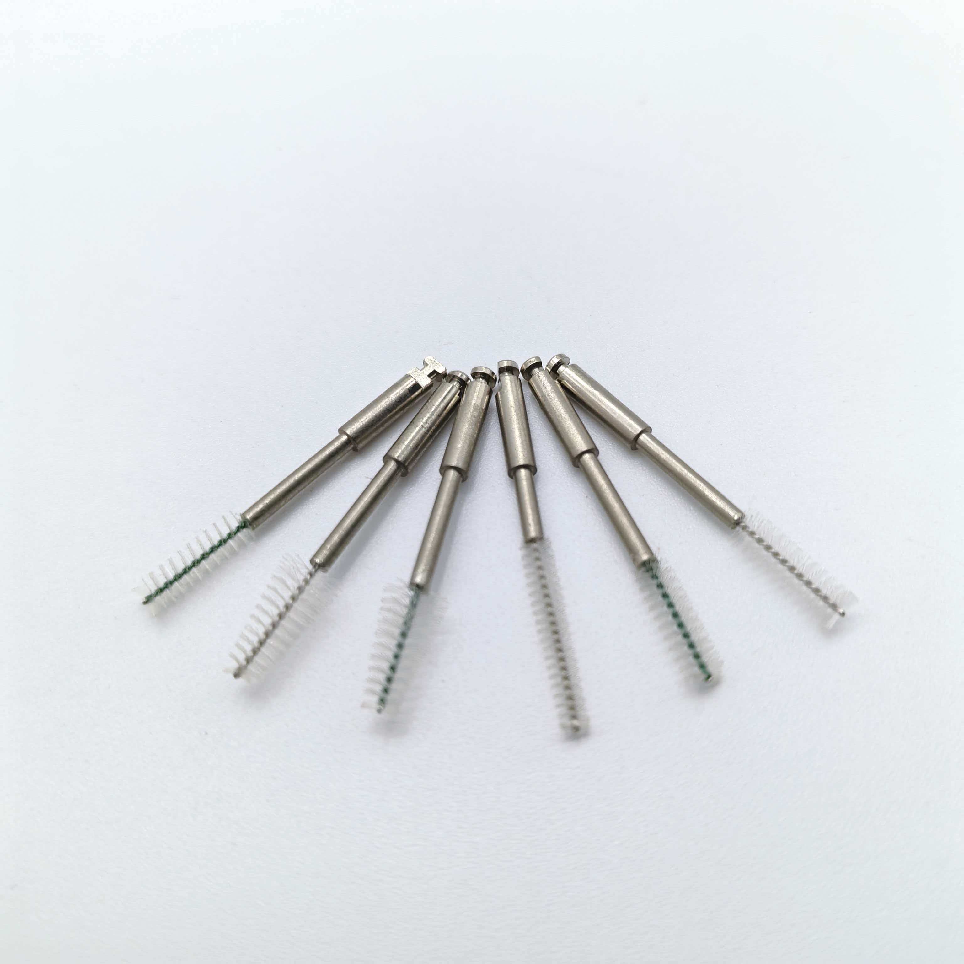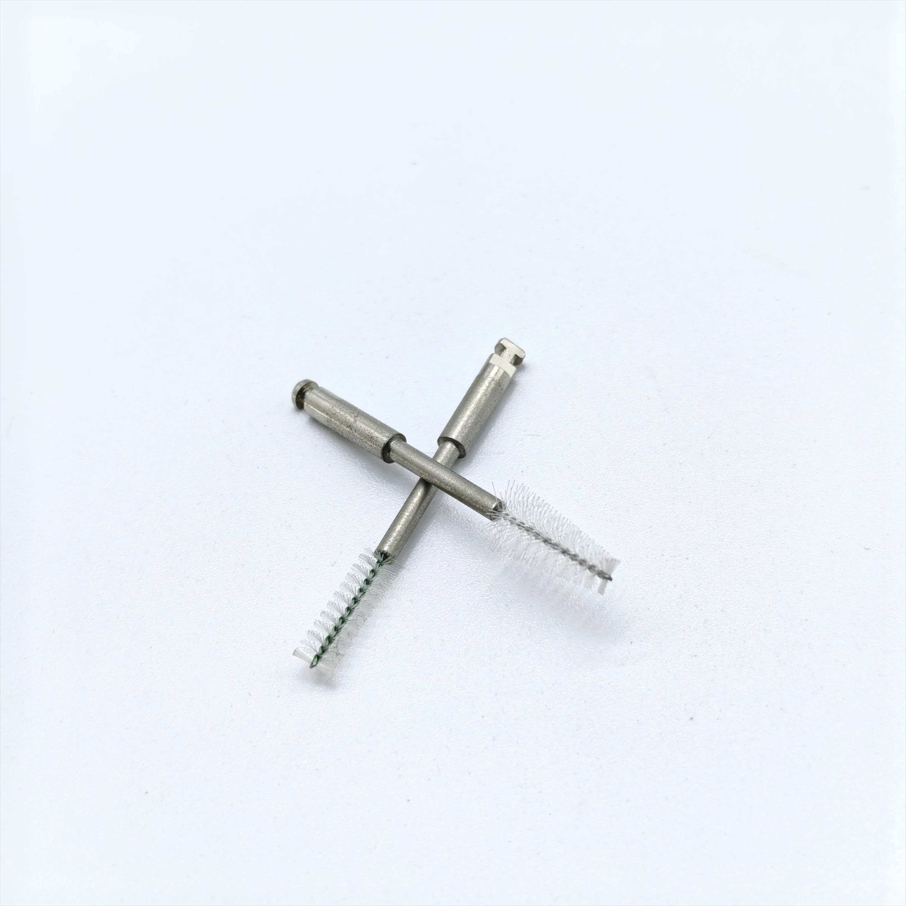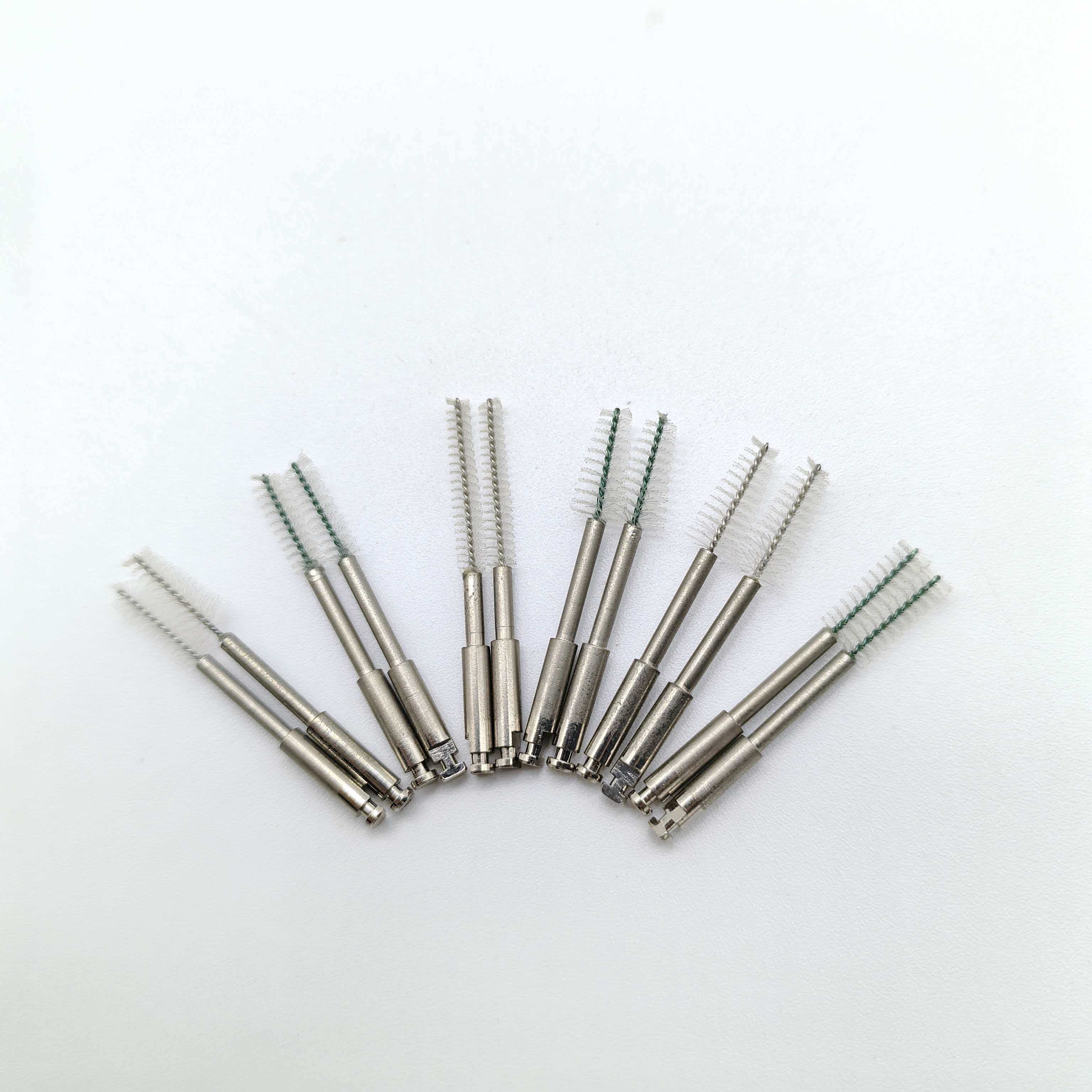 As cerdas são feitas de náilon de uso médico, dispostas em um padrão espiral para aumentar o poder de limpeza por fricção, mantendo ao mesmo tempo uma suavidade moderada. Isto evita arranhões nas paredes do canal radicular ou irritação nos tecidos periapicais, reduzindo o risco de inflamação pós-operatória. O cabo da escova contém um núcleo de metal flexível que ajusta os ângulos para seguir a curvatura natural do canal radicular, adaptando-se ao seu formato para limpeza em vários ângulos.